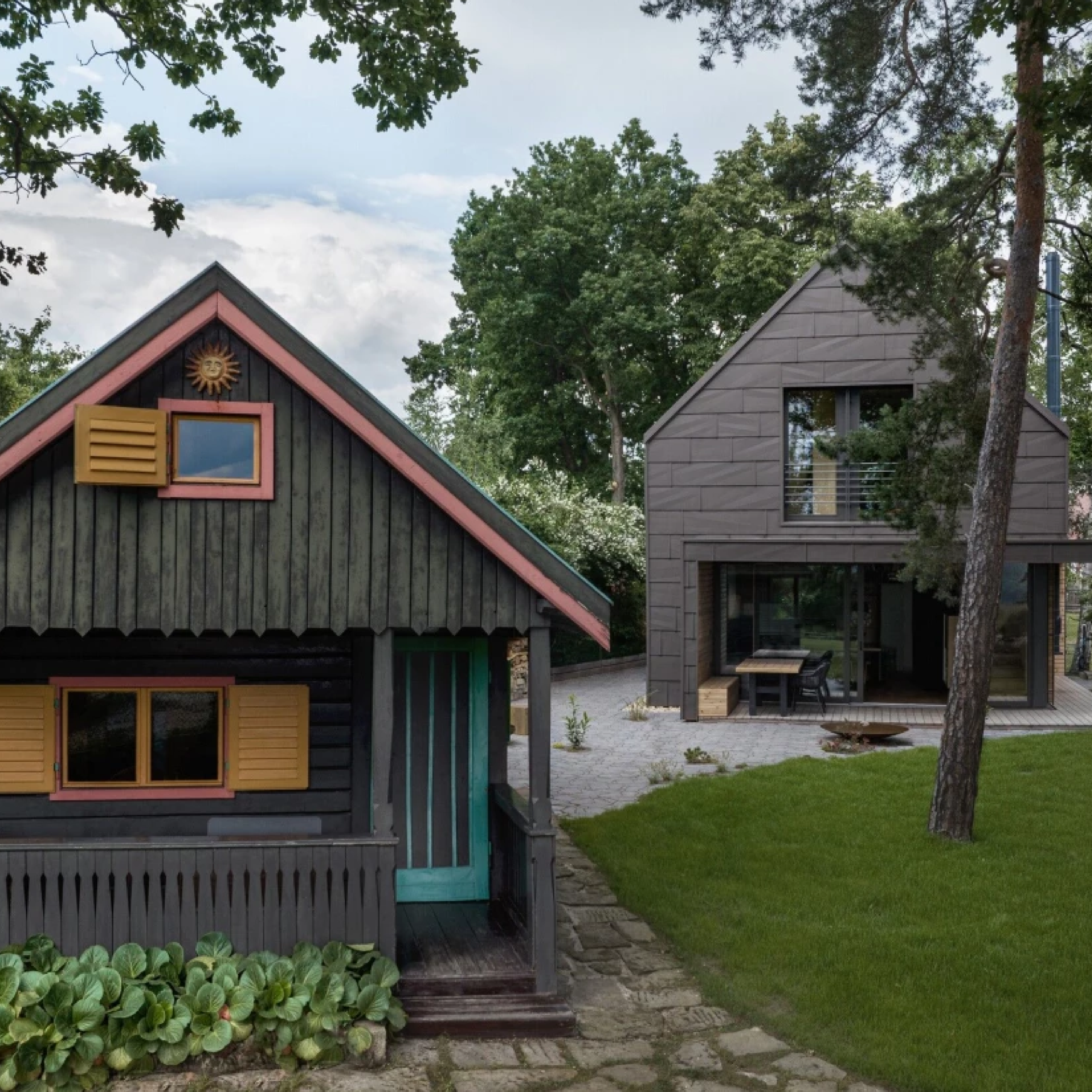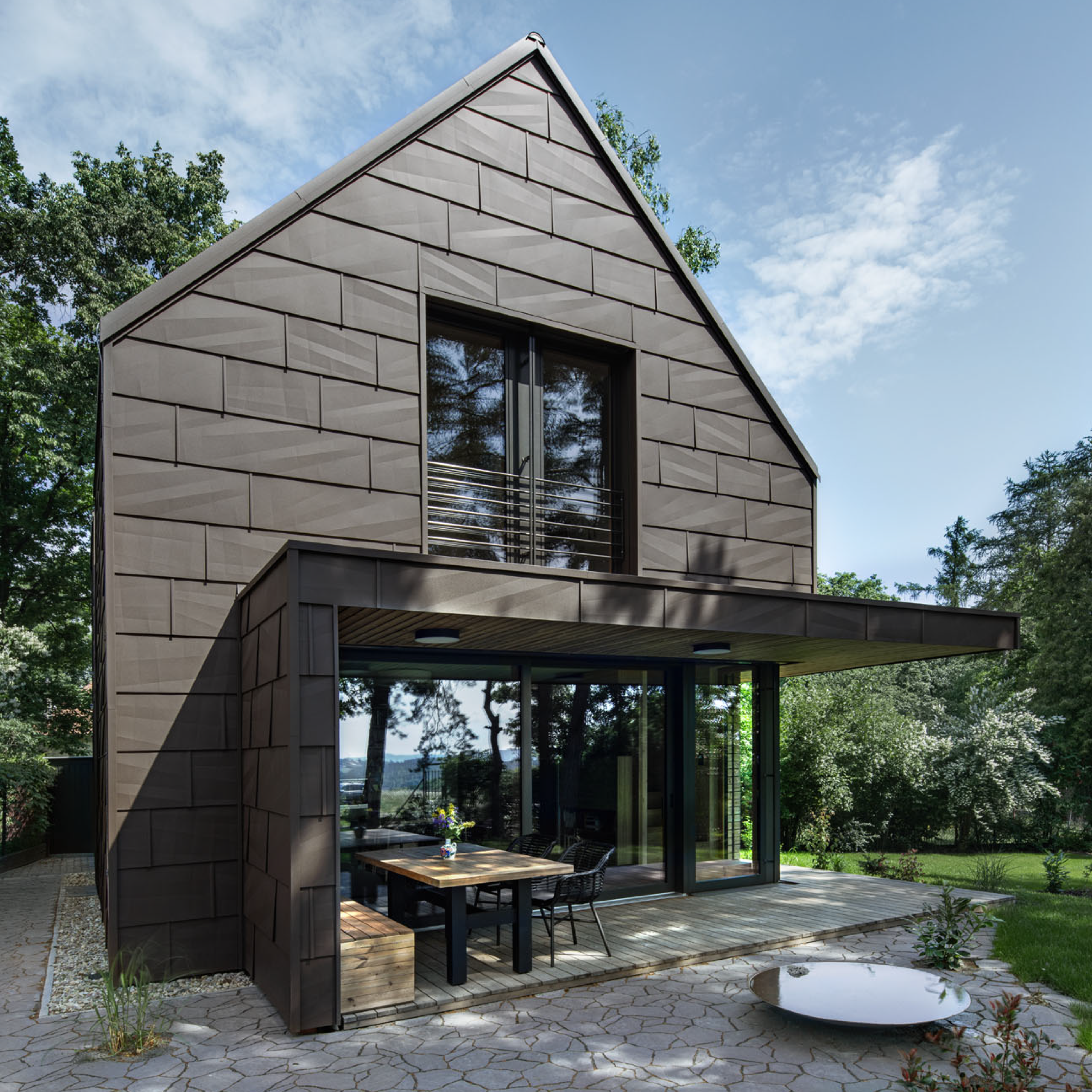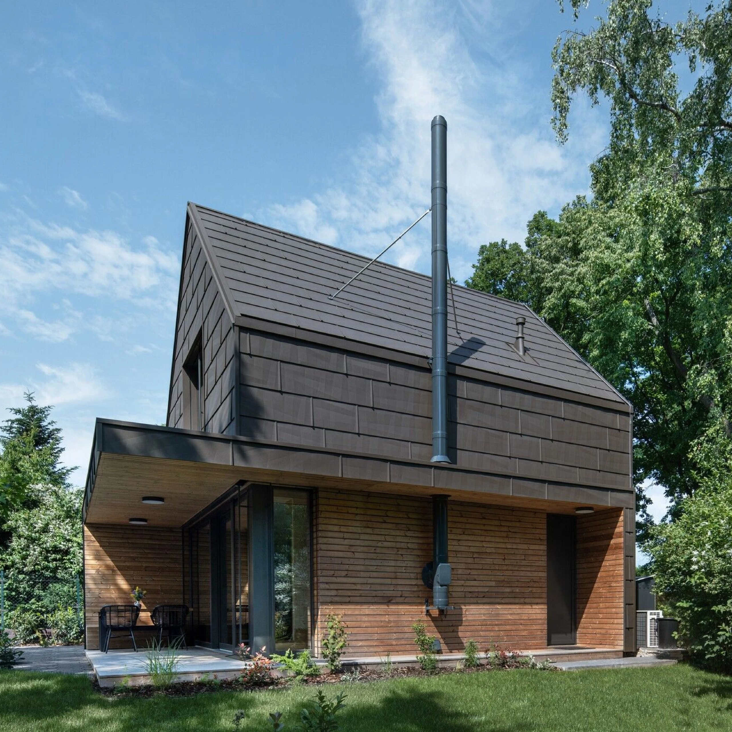 Modern cottage for family recreation offers relaxation and peace in the woods near Prague. Forest Cabin blends a pinecone-inspired aluminum façade with large windows and warm oak