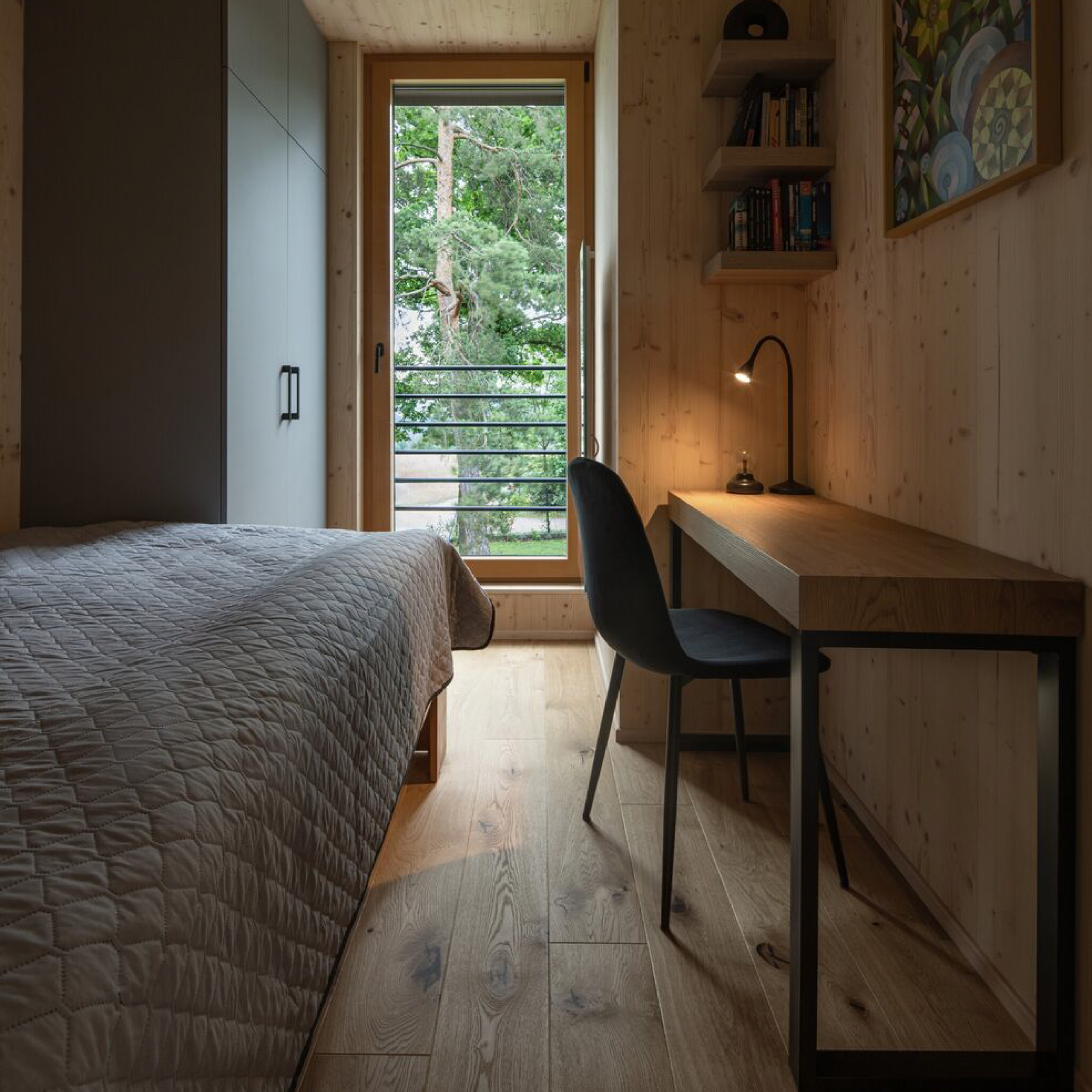 Forest Cabin is a compact woodland retreat designed for calm and comfort. Its pinecone-like aluminum façade blends with the forest setting, while large sliding windows connect the interior to nature. Warm oak finishes and visible CLT panels create a cozy, light-filled space ideal for relaxation and creative work.