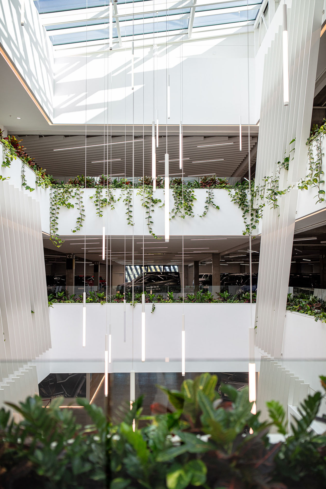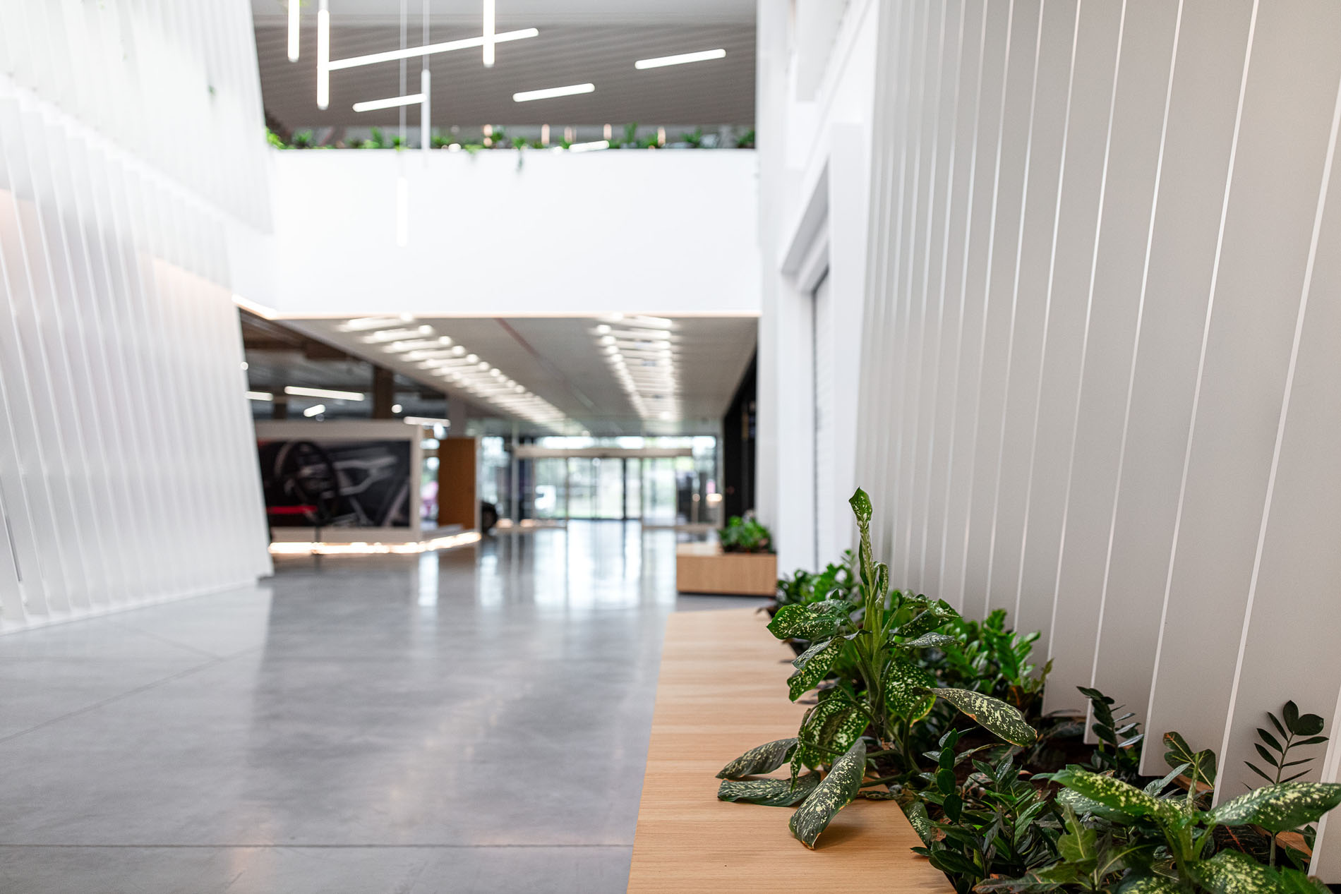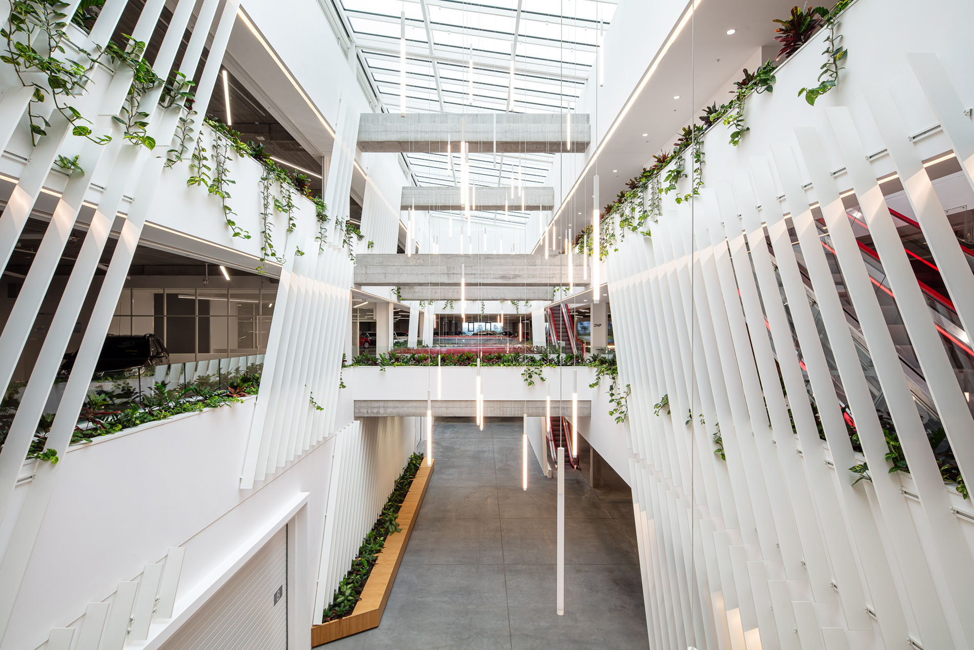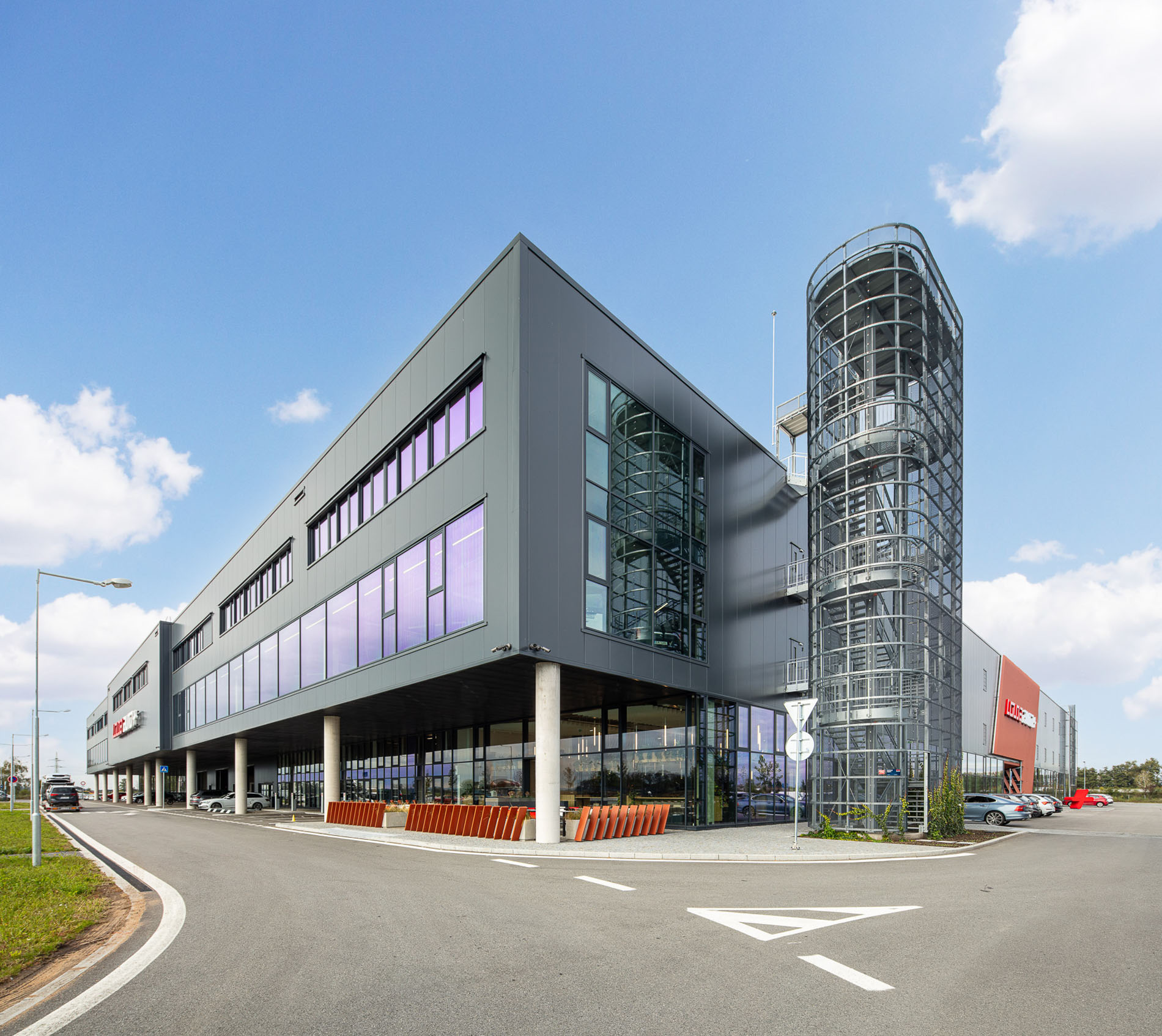 Beyond the showroom, we wove in our vision for a new generation of logistics parks: mixeduse, community-friendly, and green. The project includes a bistro with a garden, a cultural hall, extensive planting, and climbing vegetation animating the fire-stair towers and atrium.
