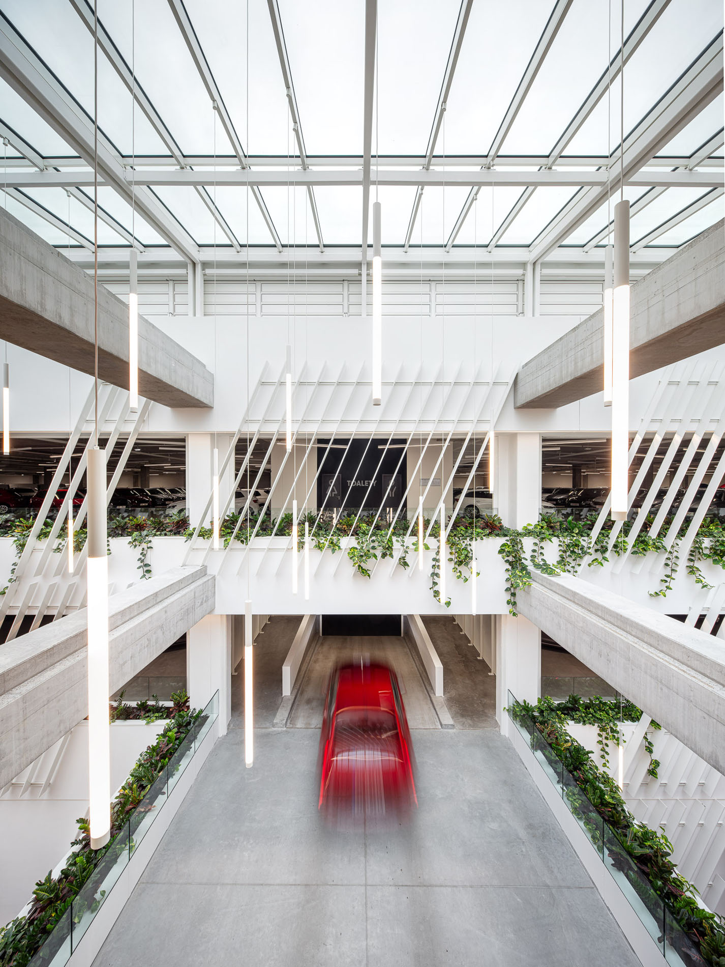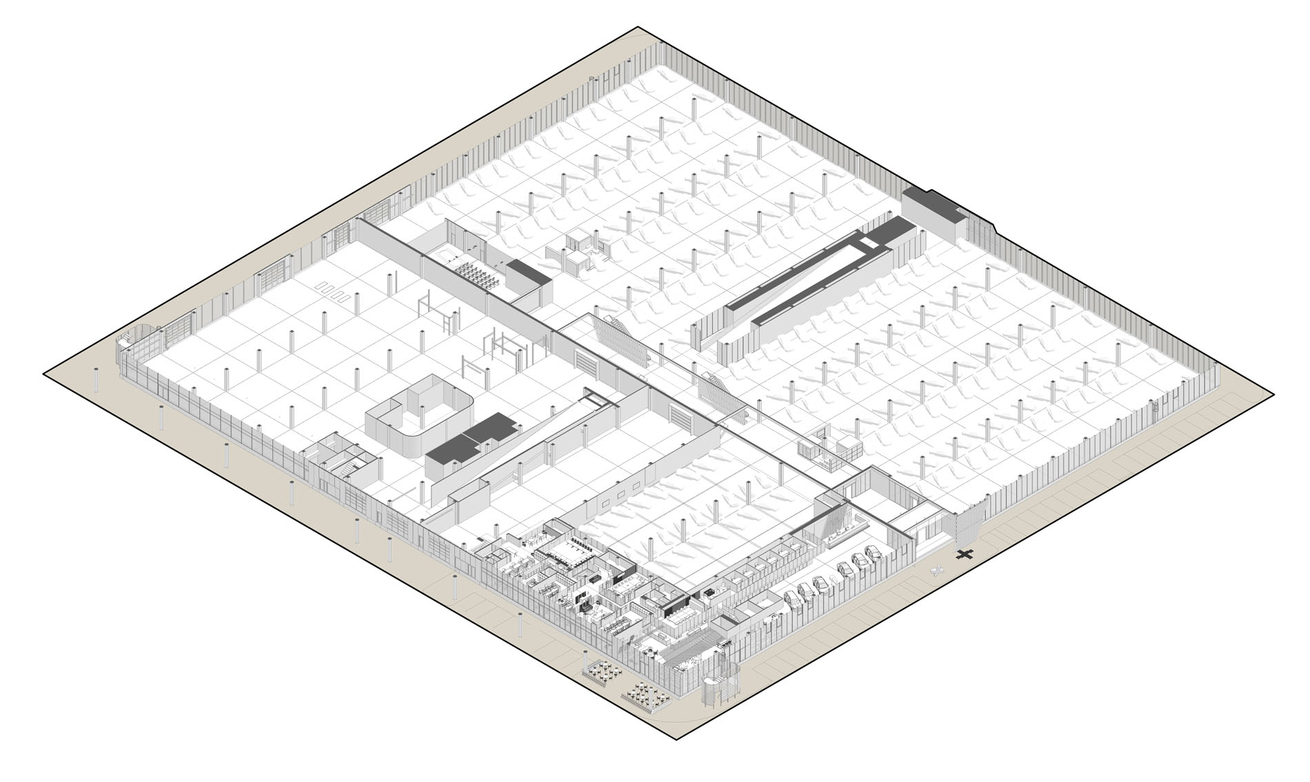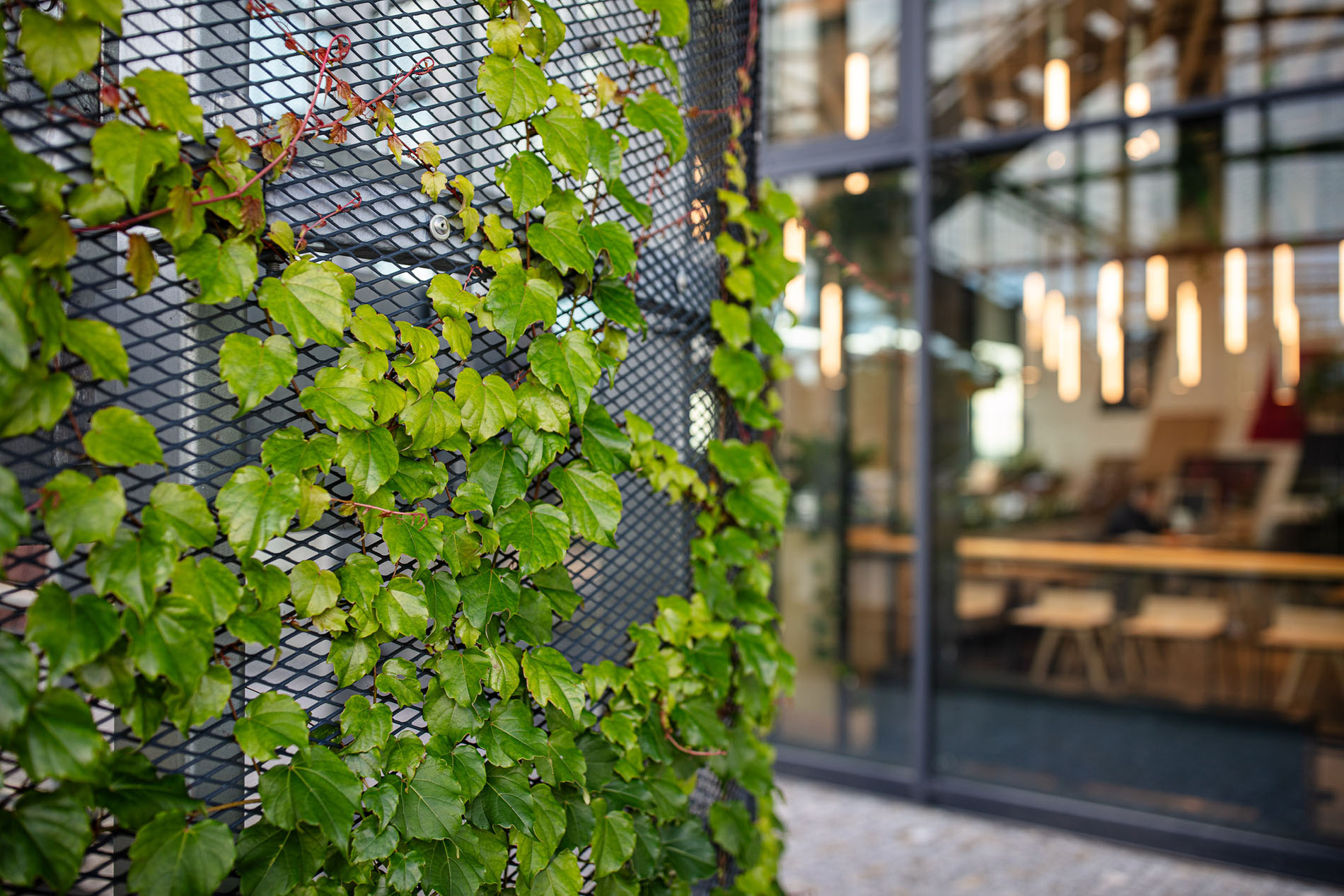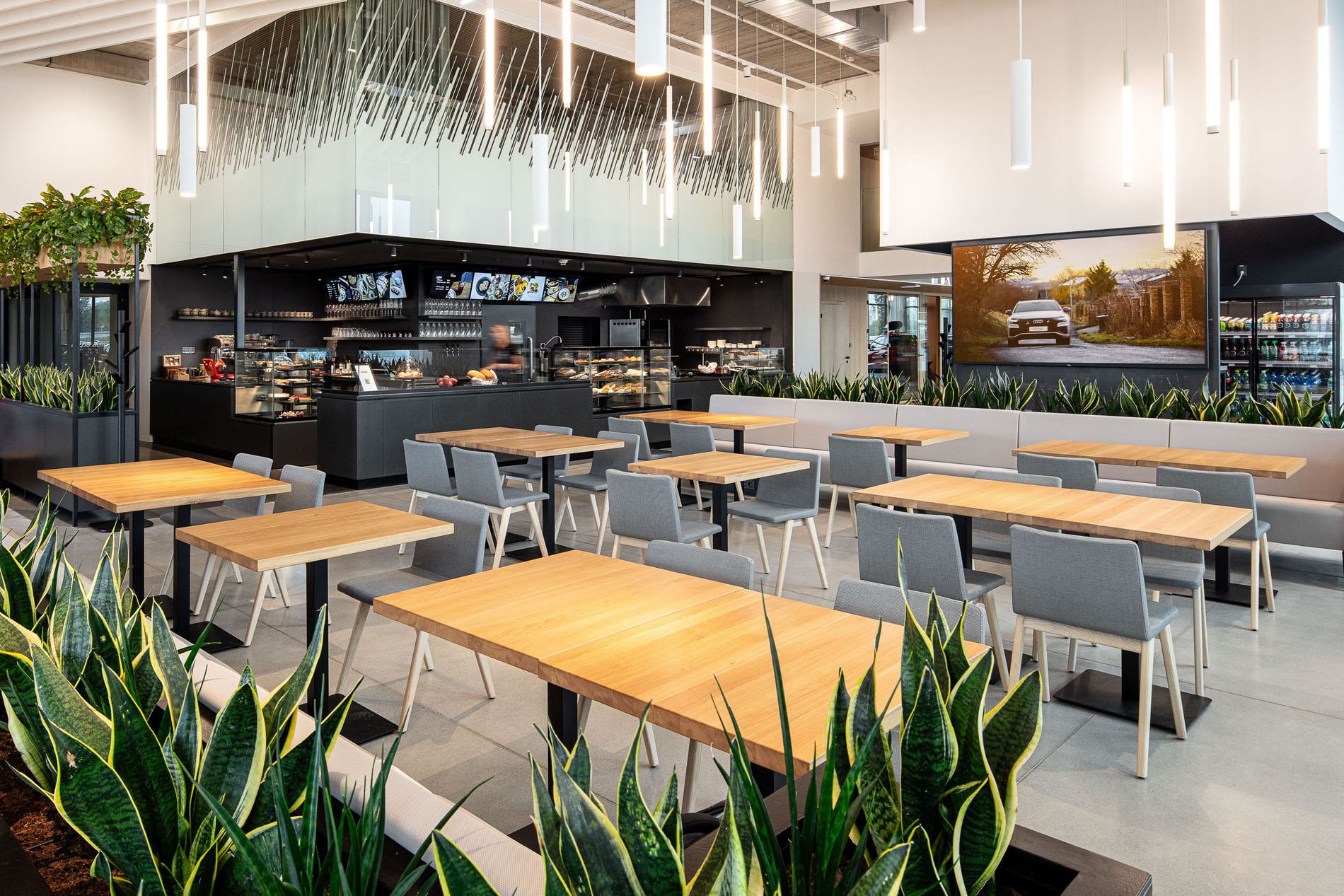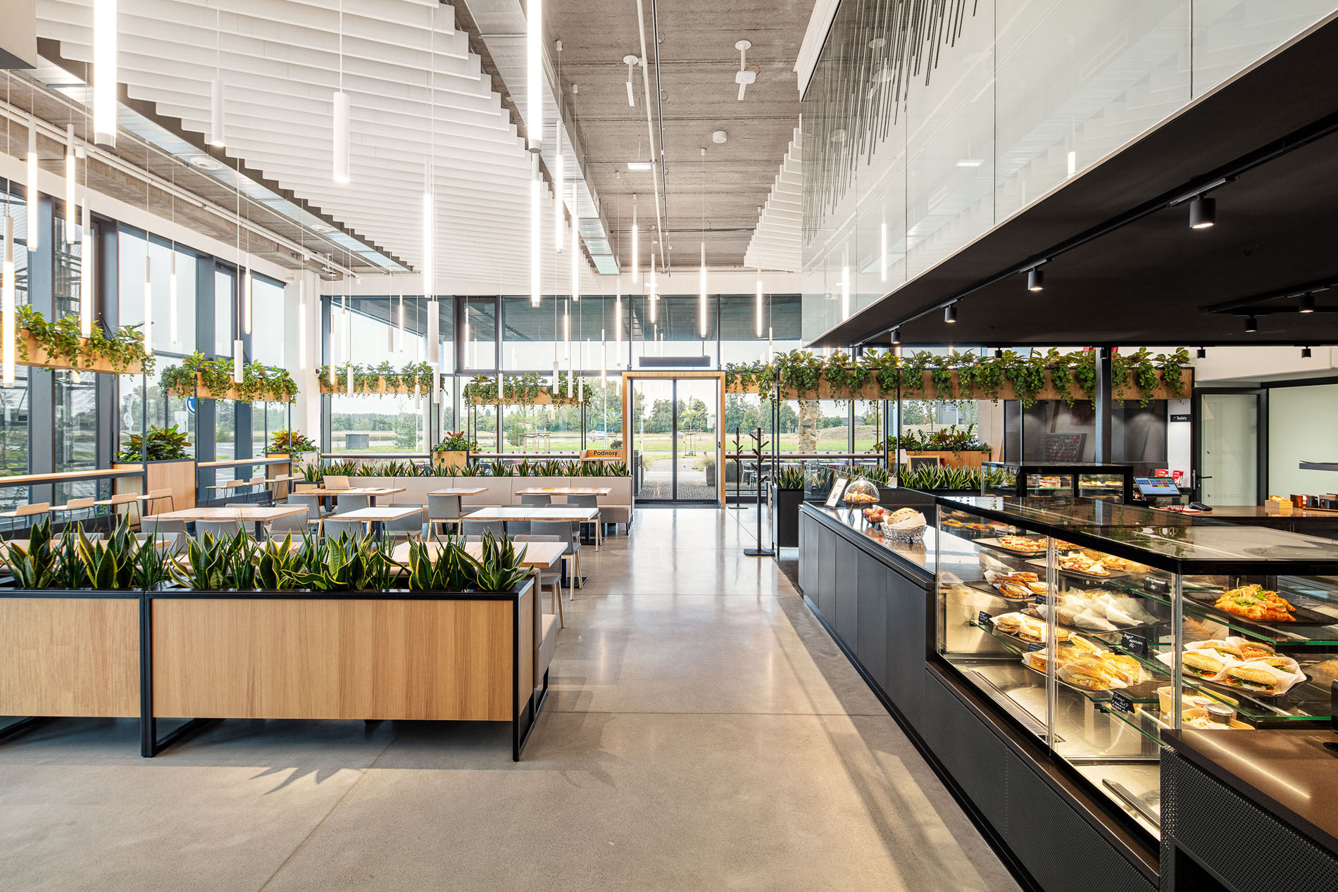 Beyond the showroom, we wove in our vision for a new generation of logistics parks: mixeduse, community-friendly, and green. The project includes a bistro with a garden, a cultural hall, extensive planting, and climbing vegetation animating the fire-stair towers and atrium.