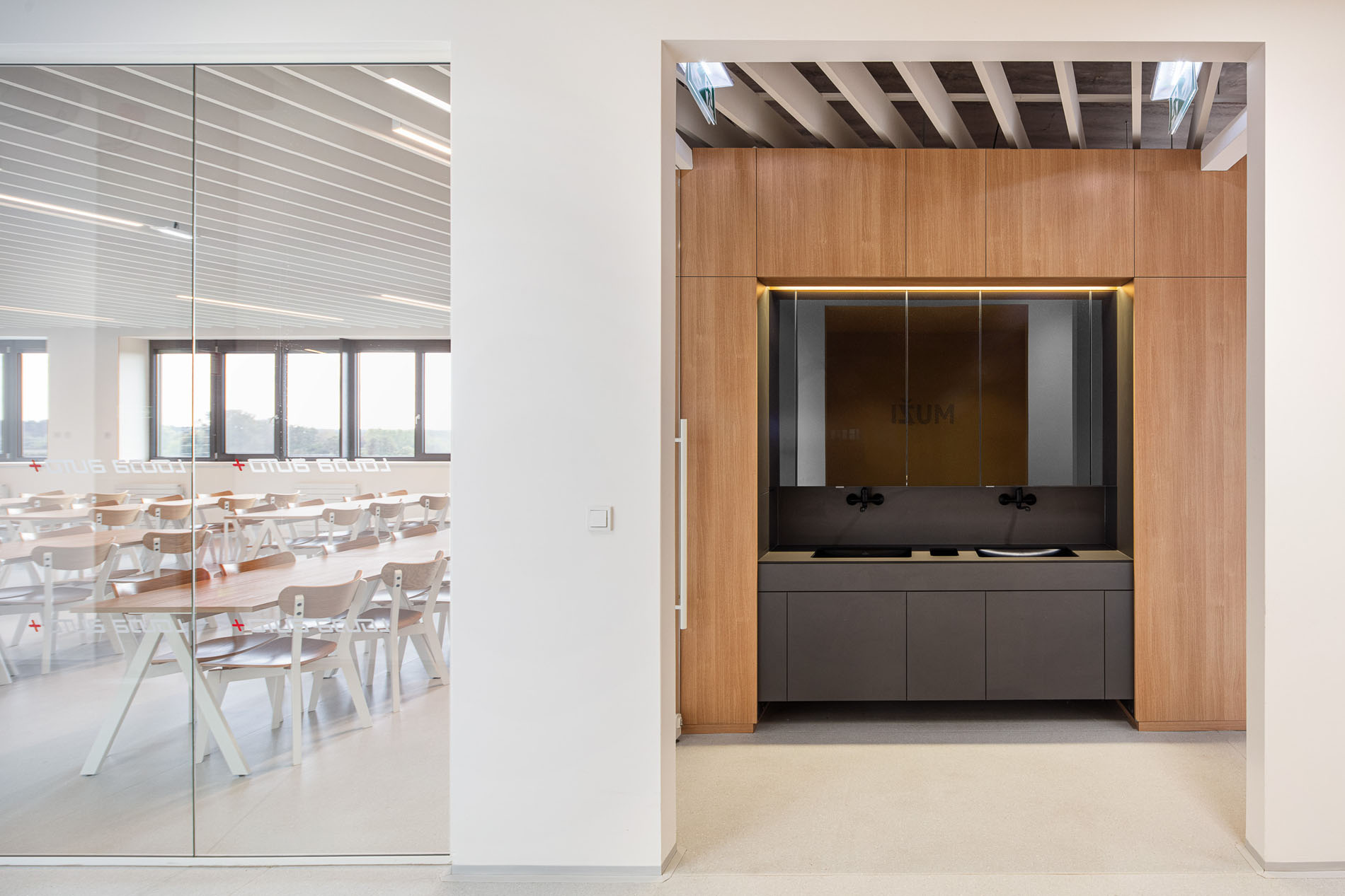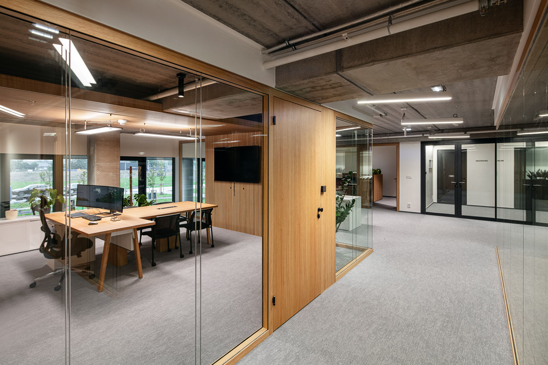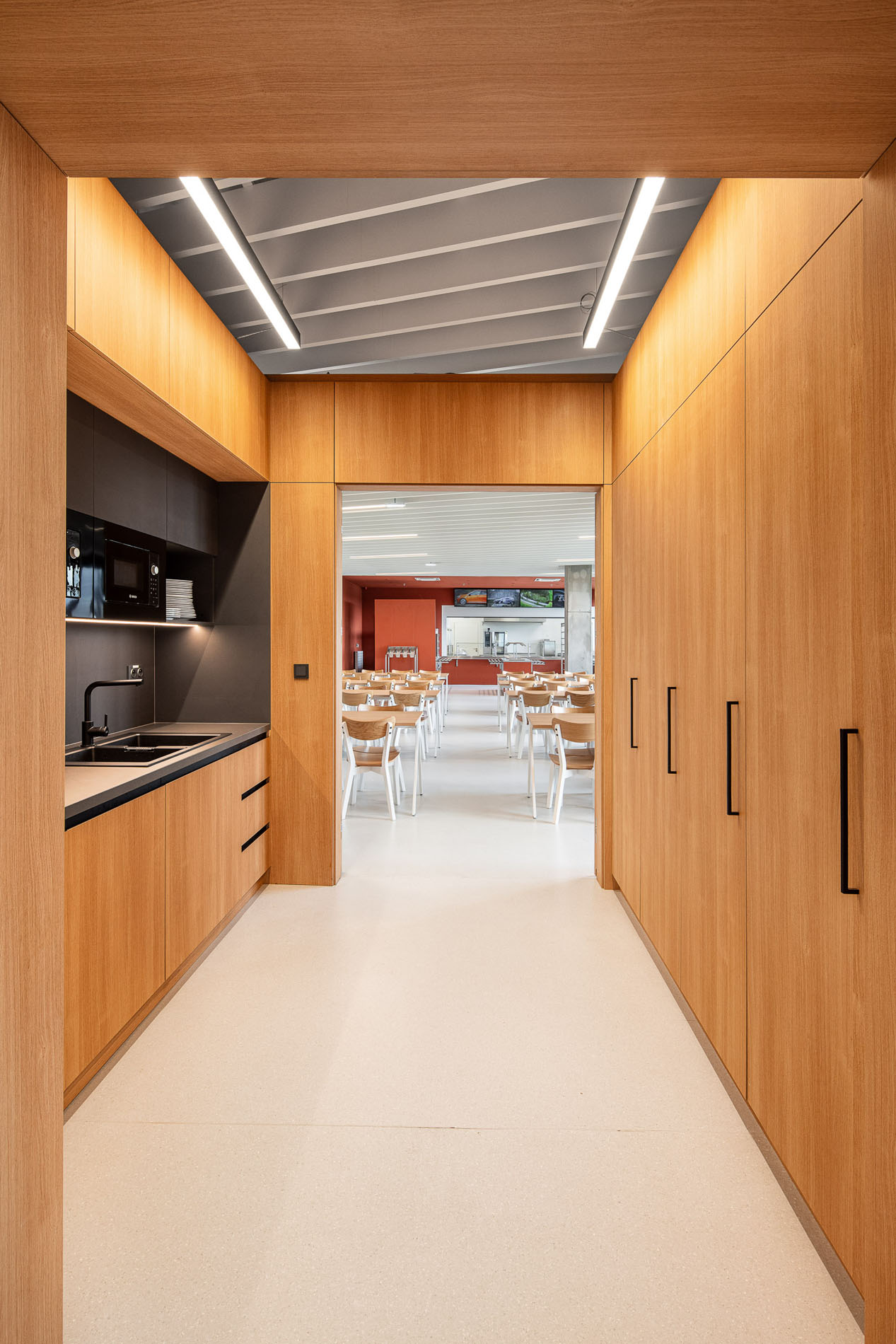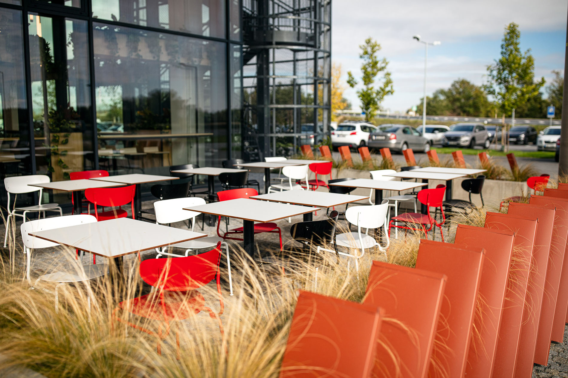 Beyond the showroom, we wove in our vision for a new generation of logistics parks: mixeduse, community-friendly, and green. The project includes a bistro with a garden, a cultural hall, extensive planting, and climbing vegetation animating the fire-stair towers and atrium.