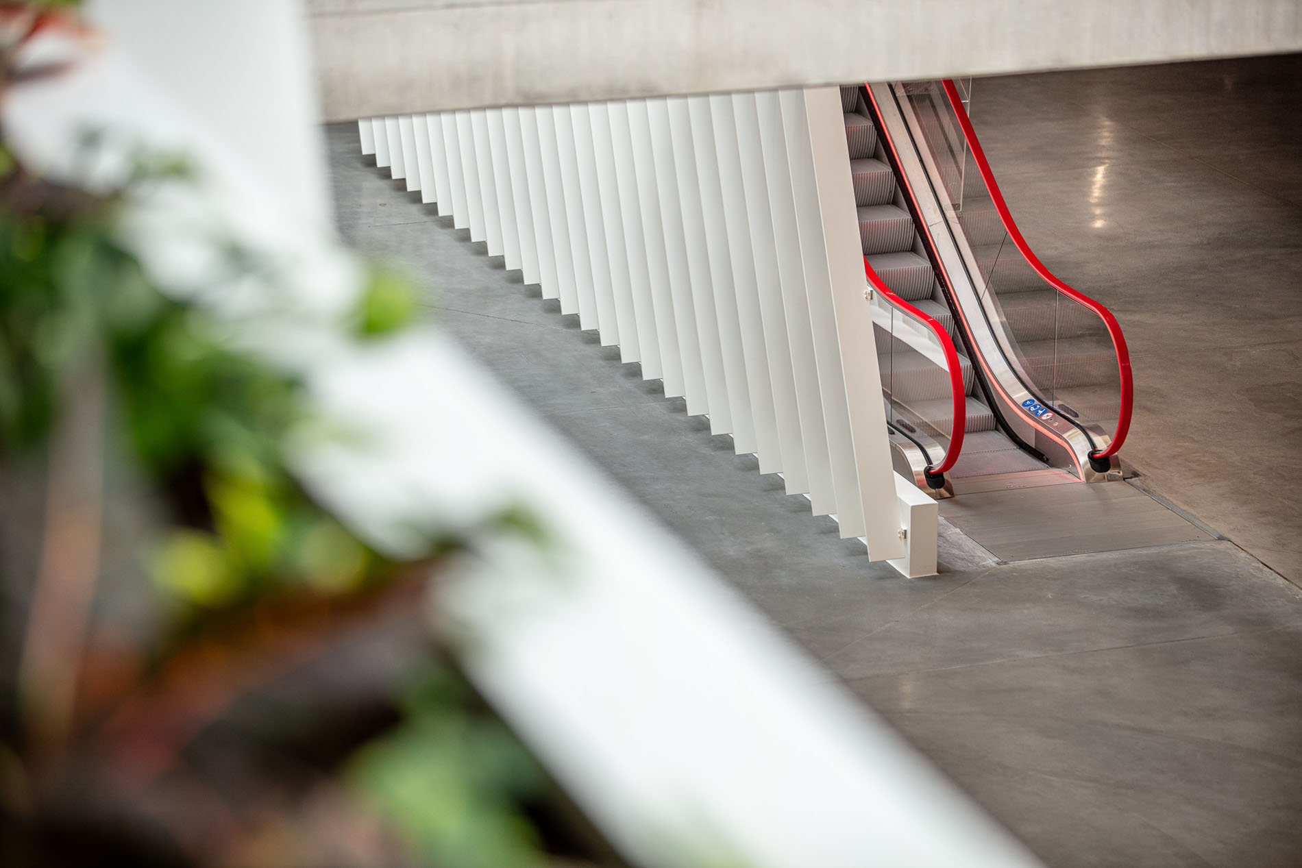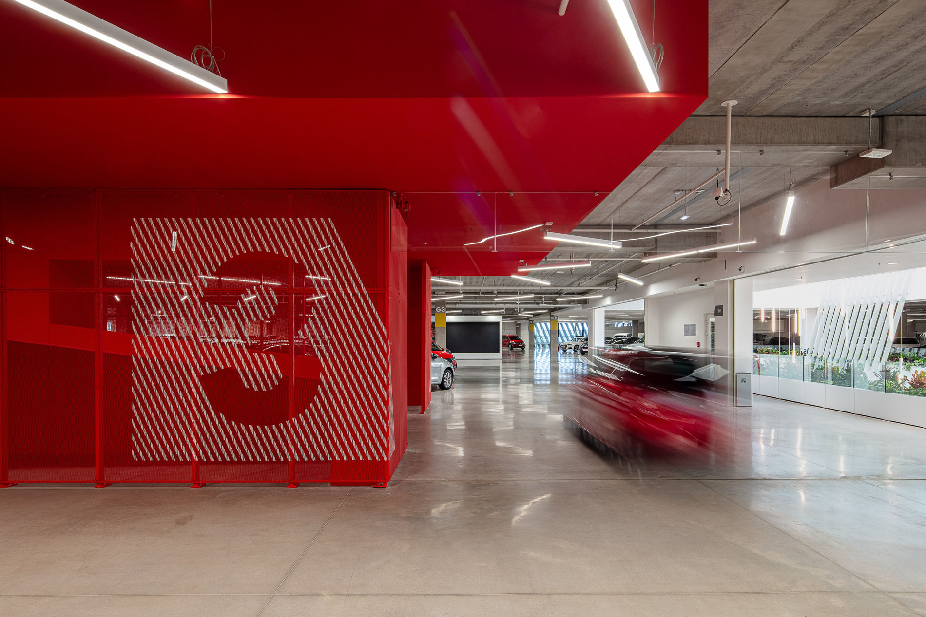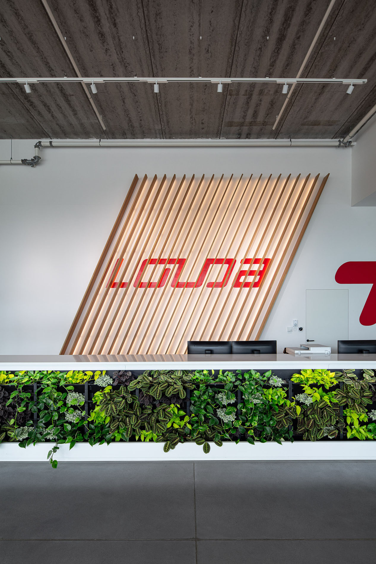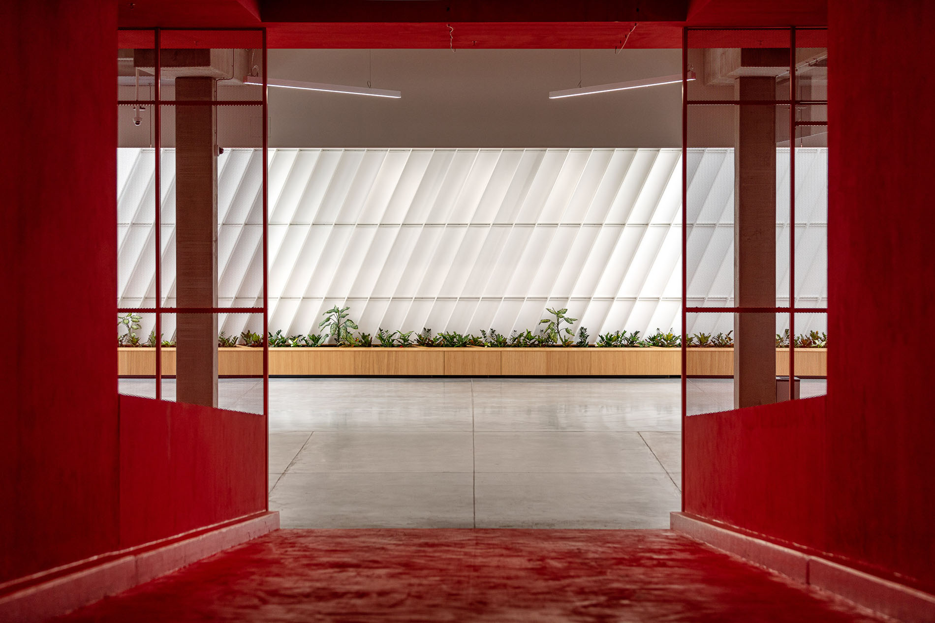 Our material choices were guided by sustainability, favoring veneer over laminate and integrating greenery wherever possible. To make the immense showroom easier to navigate, we opened a central atrium that pours natural light into space. A red ramp slices through the hall like a compass needle, leading visitors ePortlessly through all levels. The identity of the brand is distilled into a single gesture, a slat rotated 23°, echoing the tilt found in its logo and used consistently throughout.