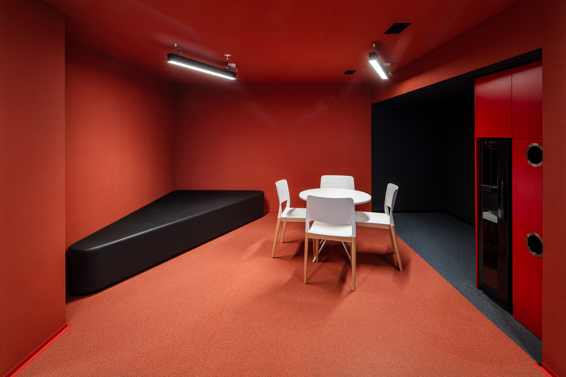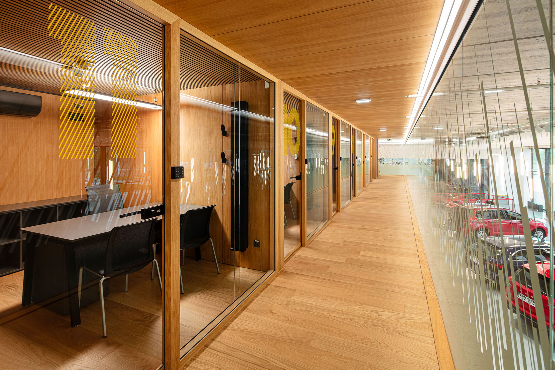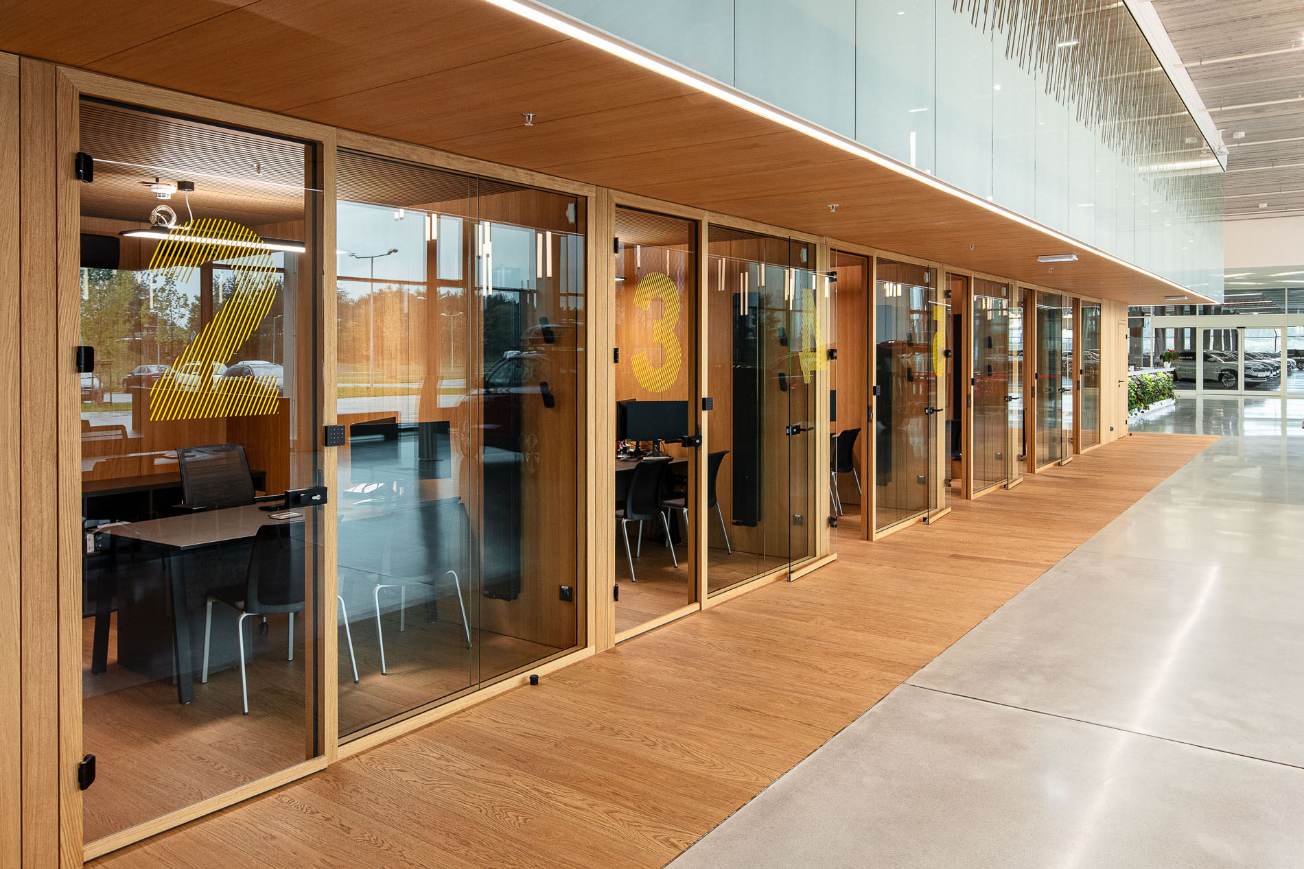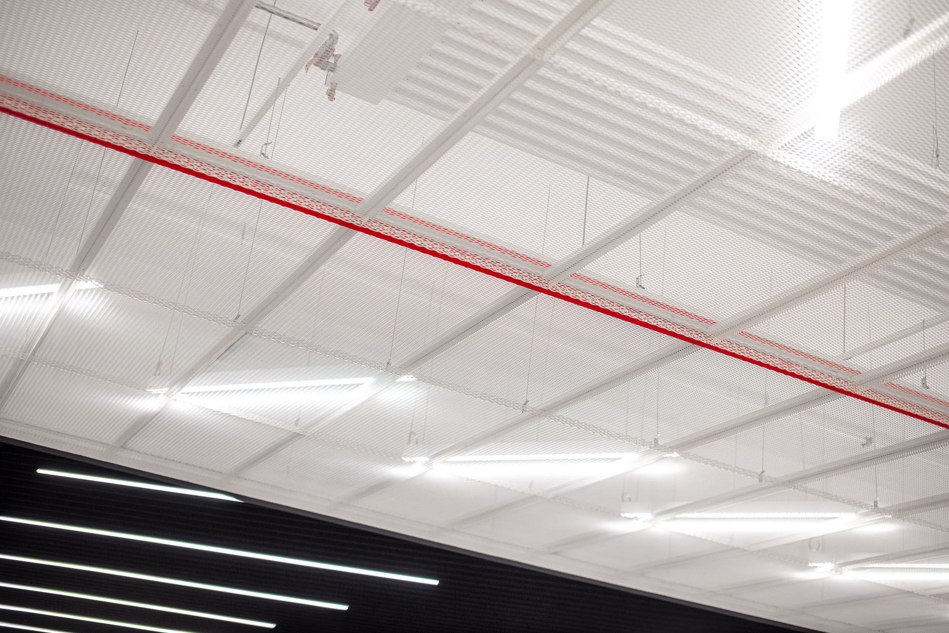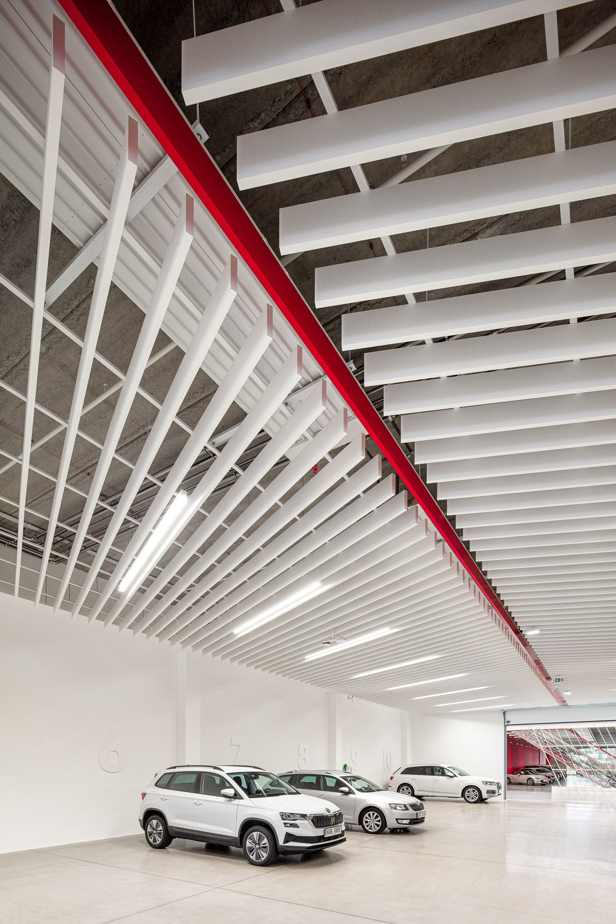 Our material choices were guided by sustainability, favoring veneer over laminate and integrating greenery wherever possible. To make the immense showroom easier to navigate, we opened a central atrium that pours natural light into space. A red ramp slices through the hall like a compass needle, leading visitors ePortlessly through all levels. The identity of the brand is distilled into a single gesture, a slat rotated 23°, echoing the tilt found in its logo and used consistently throughout.