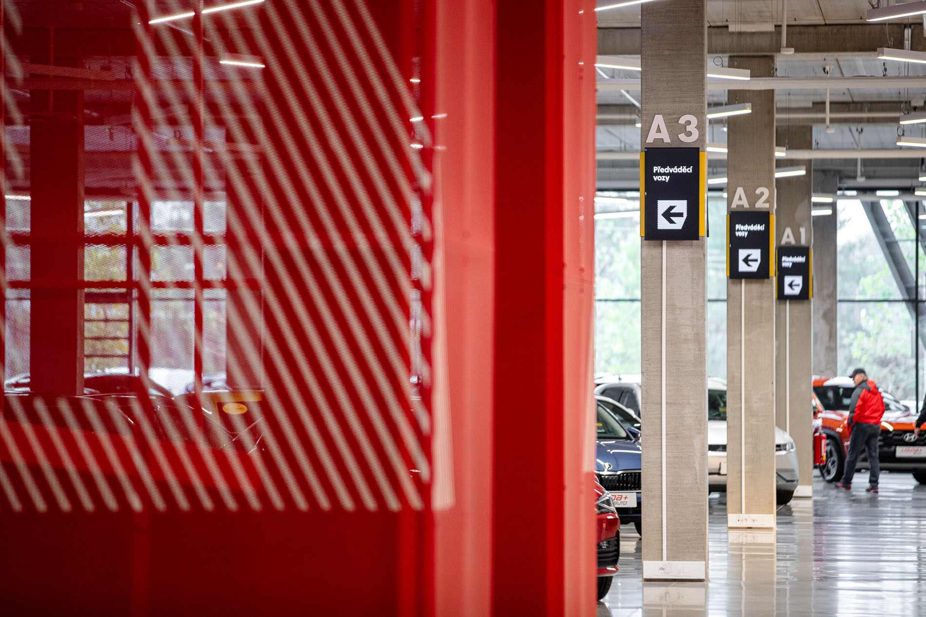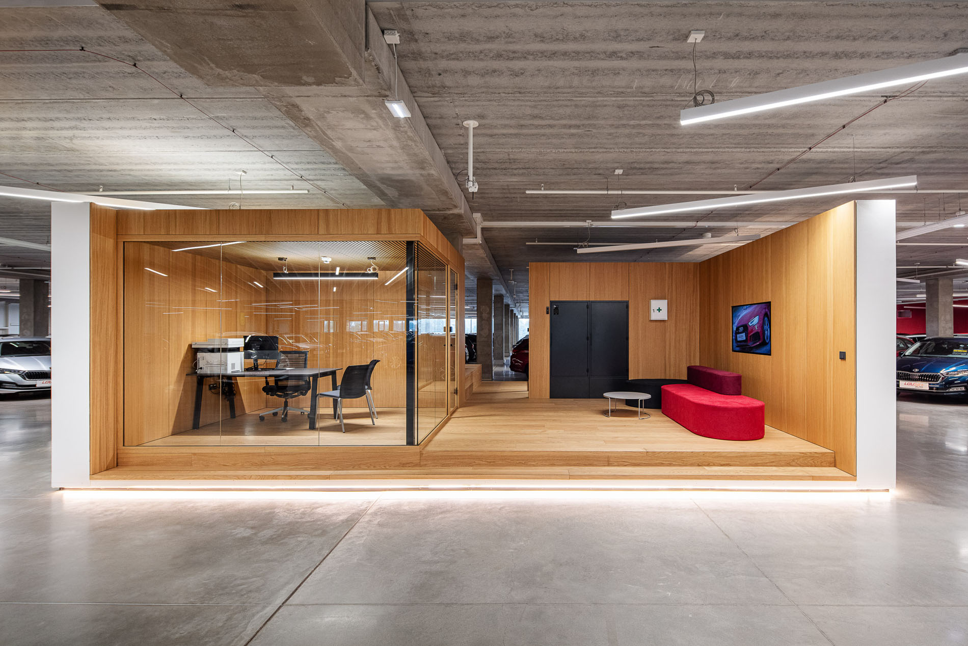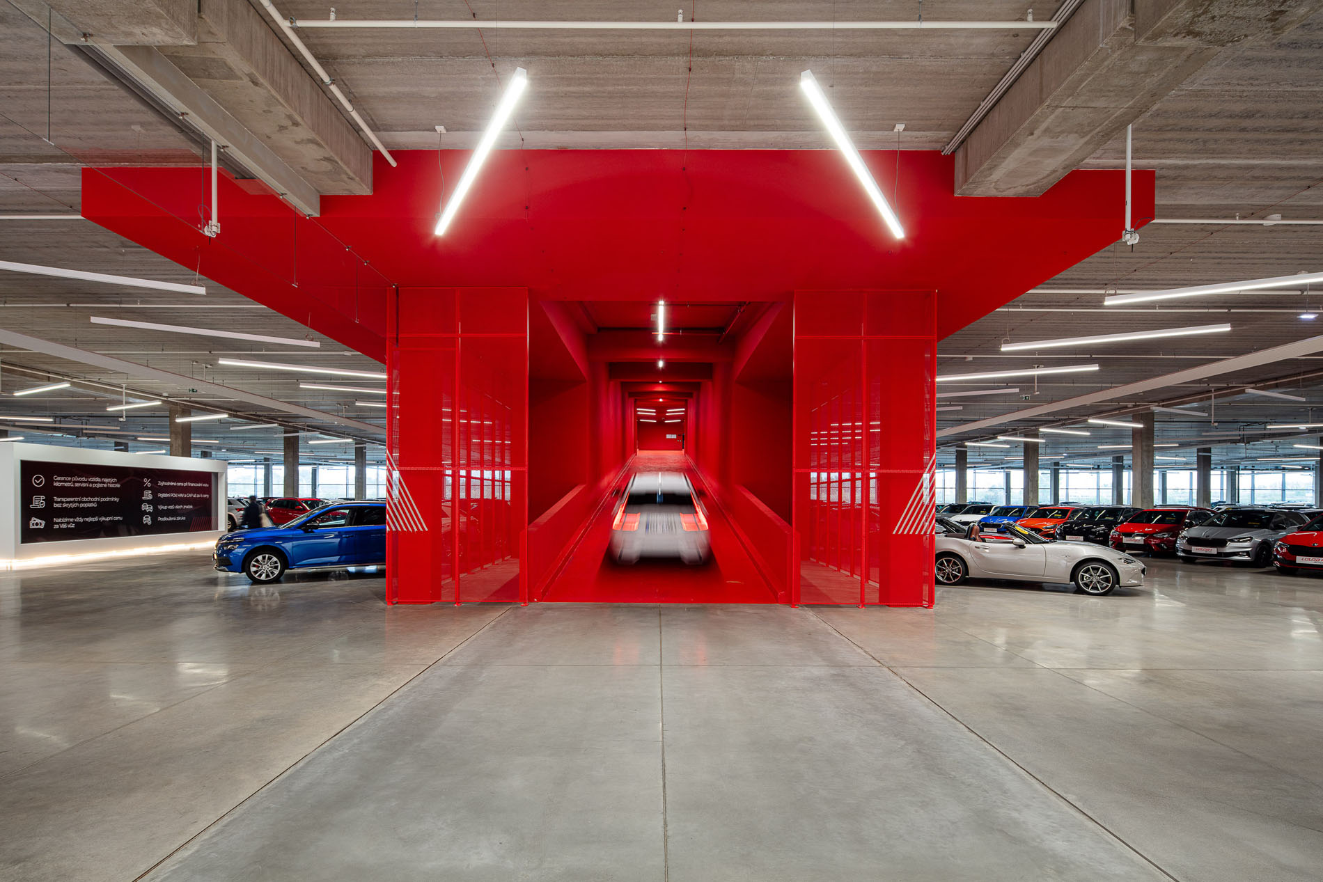 Set in the Czech Republic, this vast building, one of Europe’s largest covered car showrooms, challenged us to transform over four hectares of interior and exterior space into something memorable and human. We celebrated the honesty of the concrete structure and developed a concept of “inserted volumes,” borrowed from the image of a bitten apple: the surprise of discovering a diPerent world inside.