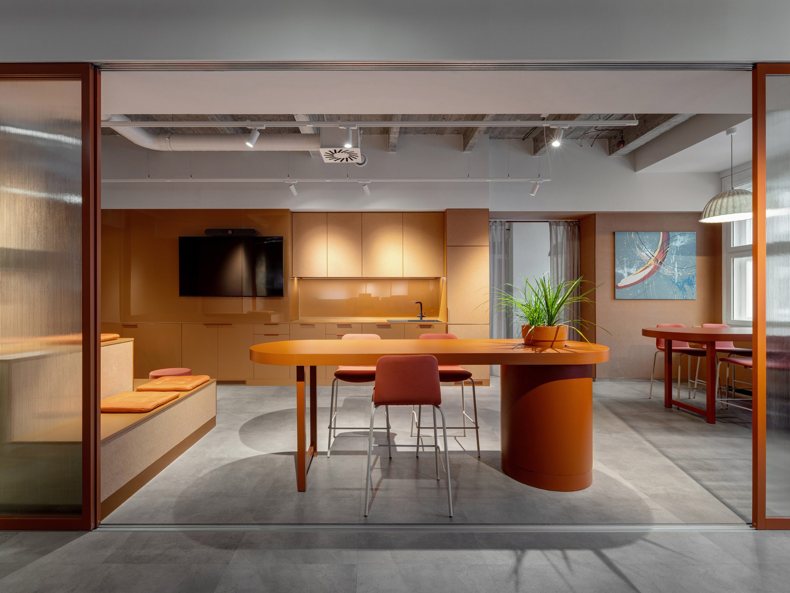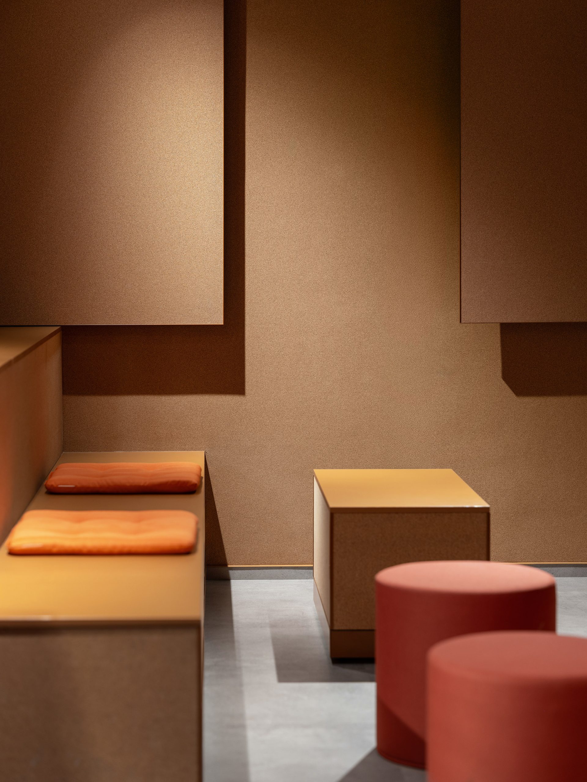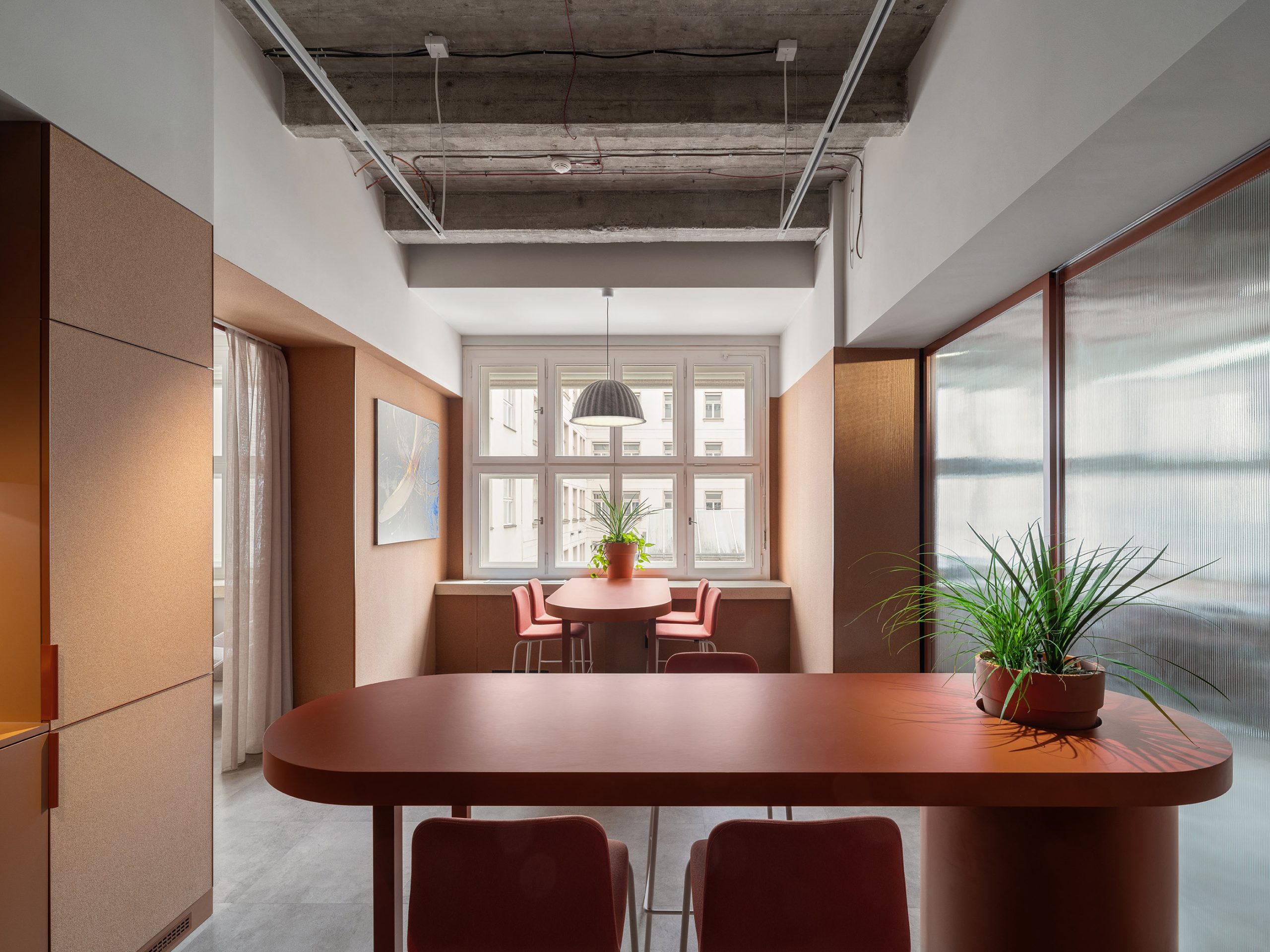 A calm palette of warm neutrals: soft clay, muted terracotta, warm wood tones, and light grey concrete—sets a focused atmosphere. Built-in elements and modular furniture establish strong spatial logic, while filtered glass and transparent partitions allow light to move freely through space.