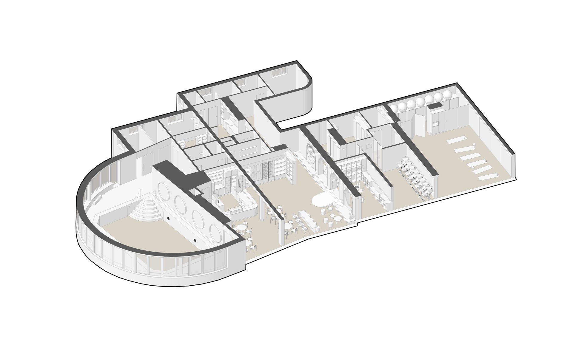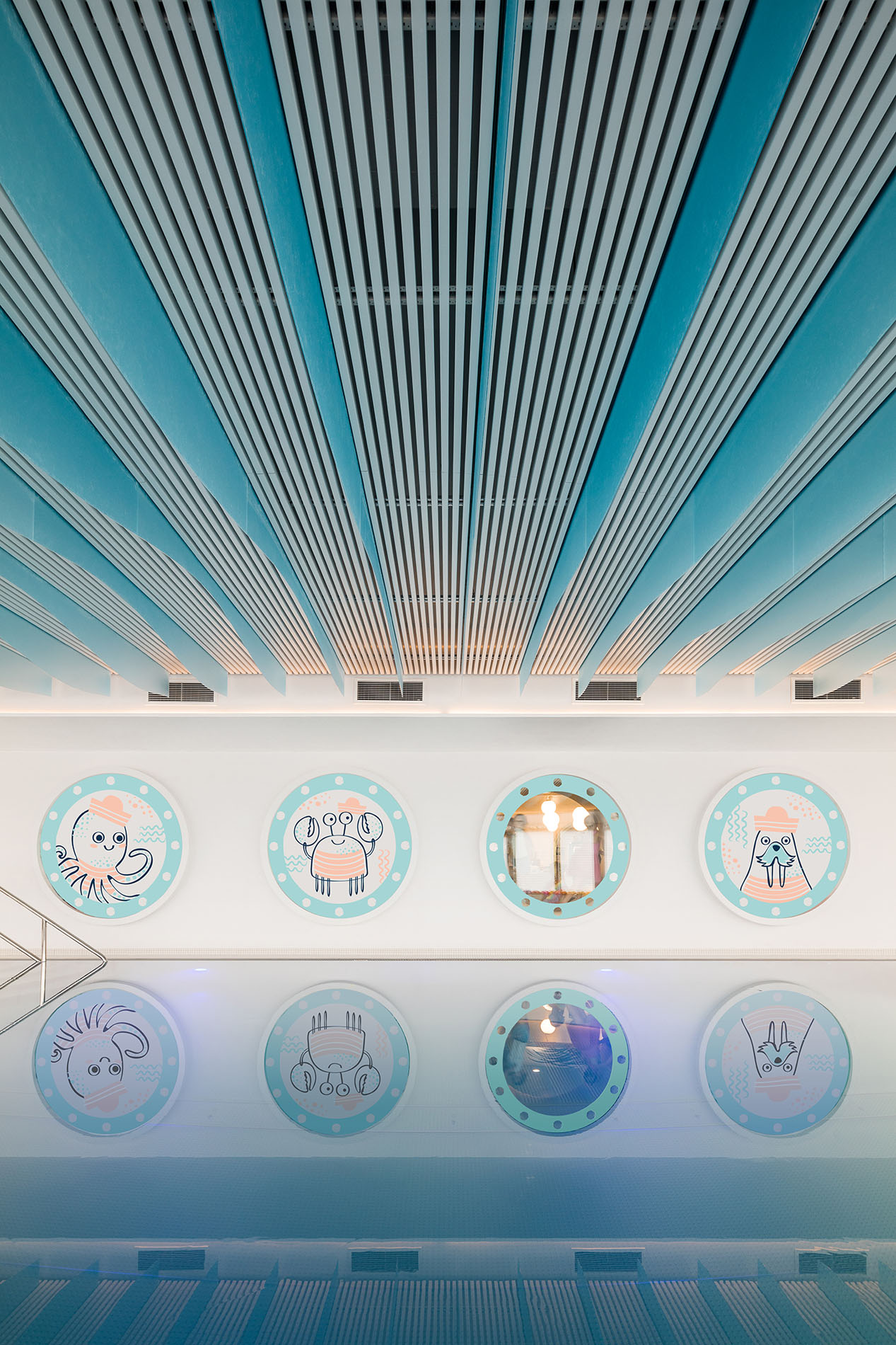 We organized the plan by separating wet program areas from the dry lobby and exercise spaces, introducing selective internal glazing to maintain light and visual continuity. The design language draws from aquatic and nautical themes, expressed through a curated color scheme and custom interior elements that evoke the underwater landscape.