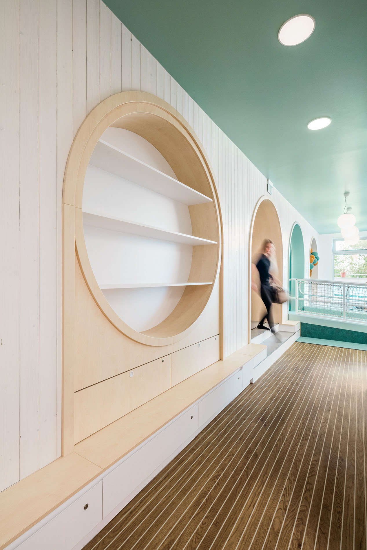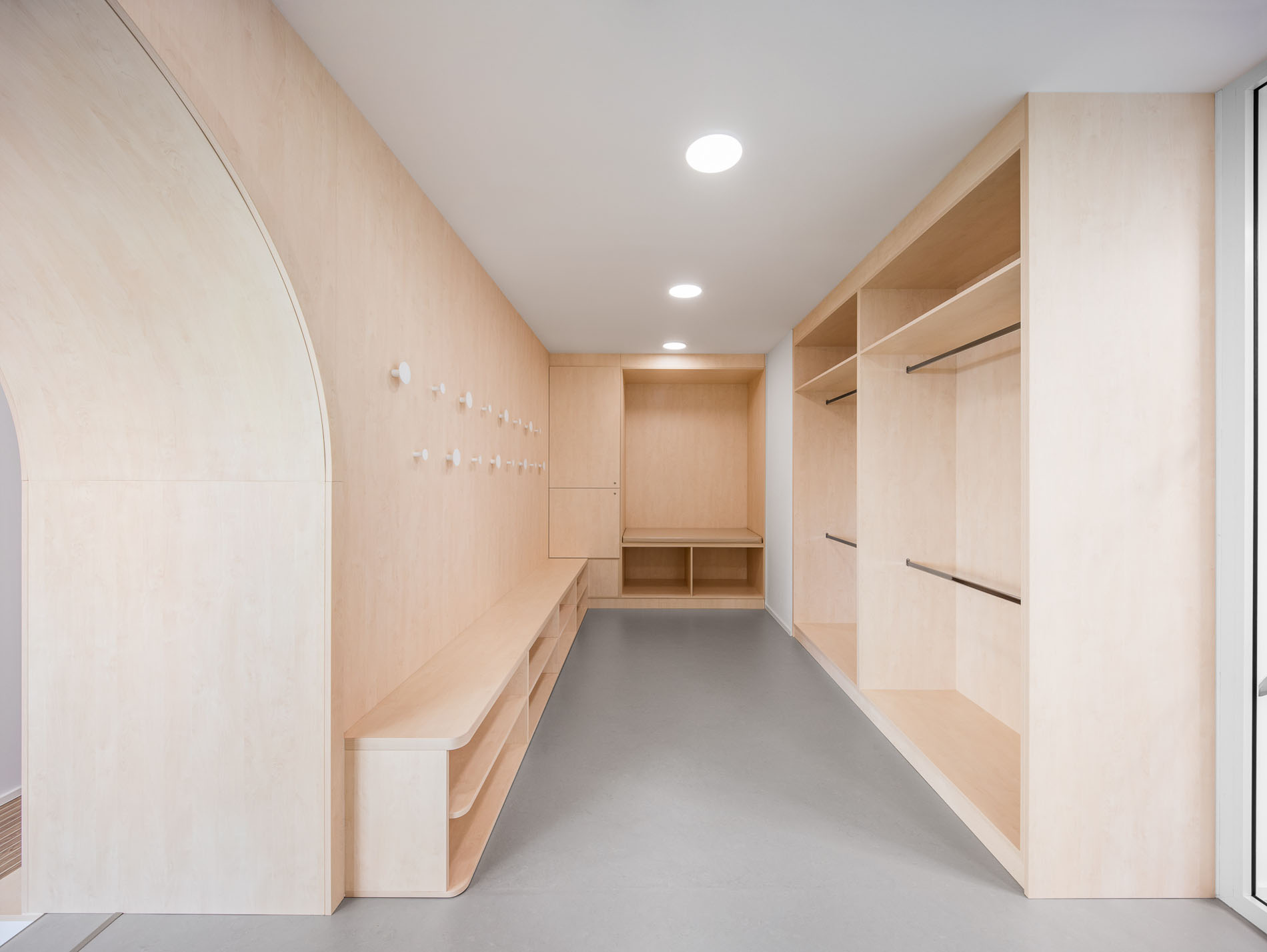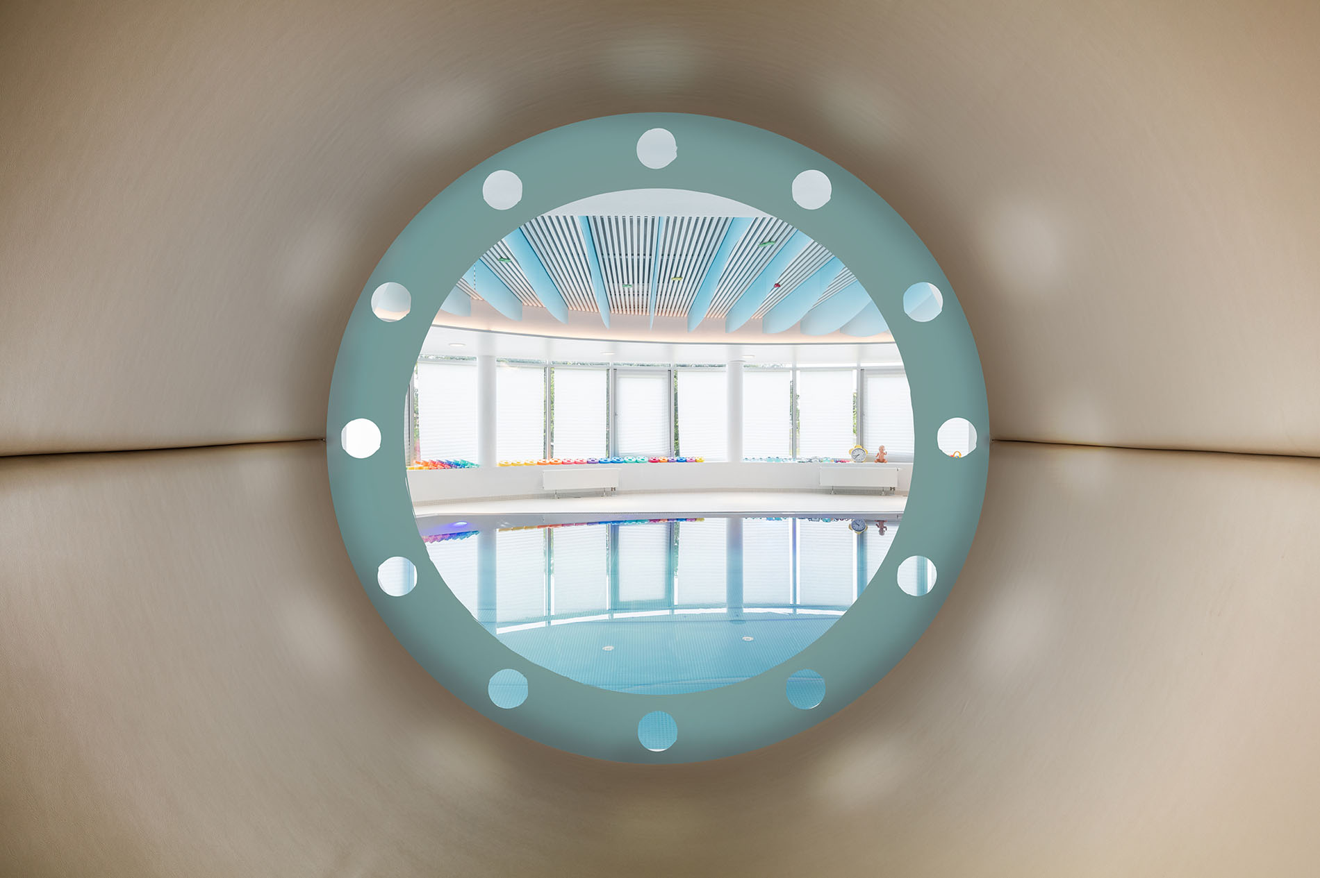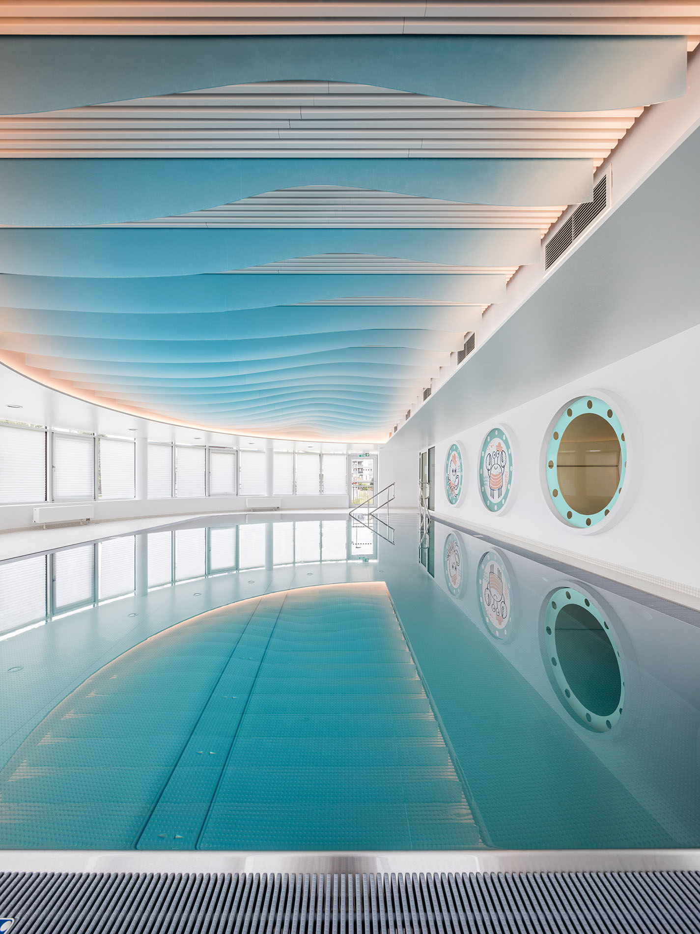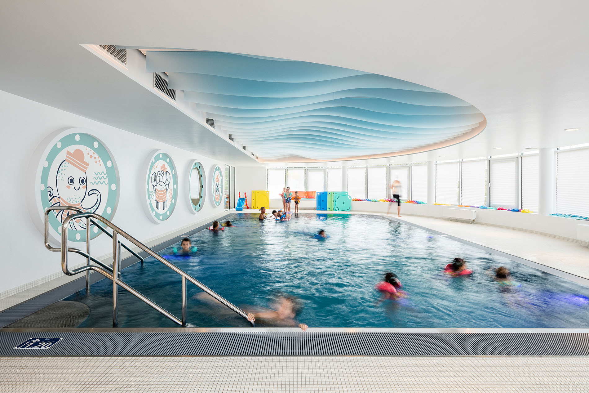 The project brief called for a child-friendly, highly functional interior for a swimming center, with close attention to safety, accessibility, and minimal intervention in the existing building shell. With the stainless-steel pool already specified and installed within the apartment complex, our design strategy focused on optimizing the surrounding environment.