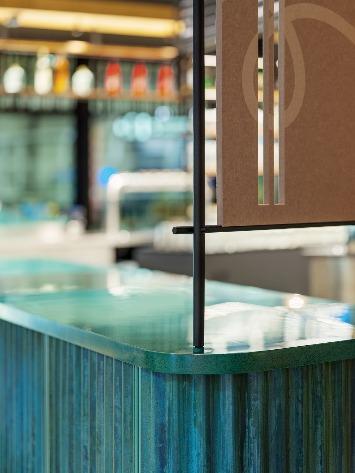 The design language draws directly from aviation infrastructure. Repeating linear elements, referencing airflow and runways—became a unifying motif across the space and the brand. This concept was translated into material expression through corrugated metal, used in custom furniture partitions, painted tubular elements, sheet metal details, and ceramic wall tiles, creating a rhythm that is both industrial and precise.